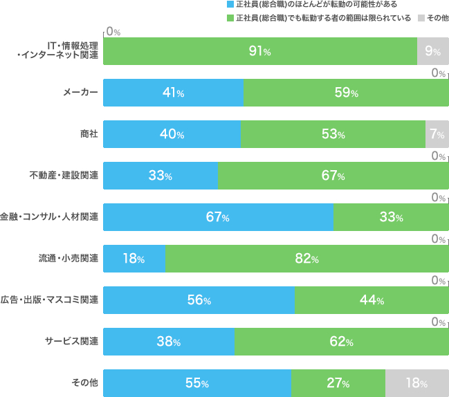 社員の転勤制度の有無を聞くと、「ある」と回答した企業は5割強。従業員数(拠点数)に比例して、転勤のある会社が多いことが見て取れます。業種別では「流通・小売」、「商社」で転勤が多い結果になりました。