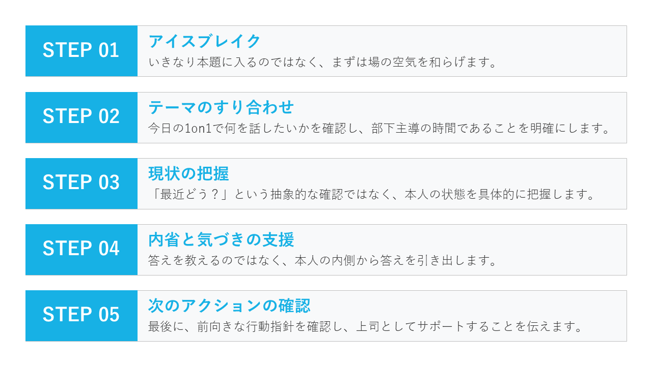 最後に、前向きな行動指針を確認し、上司としてサポートすることを伝えます。1. スモールスタート